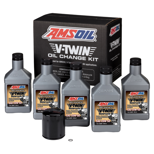 - Includes five quarts of AMSOIL 20W-50 Synthetic V-Twin Motorcycle Oil, one black AMSOIL Motorcycle Oil Filter and one drain-plug O-Ring